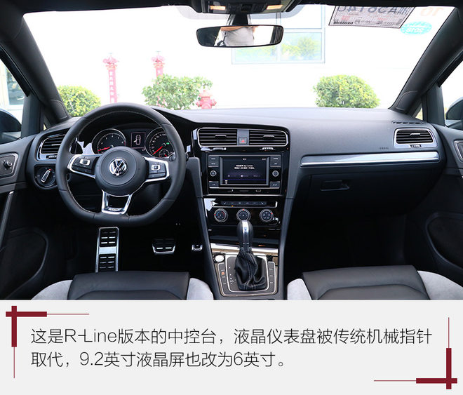 试驾过程中我也拍到了R-Line版本的中控内饰全景图,首先映入眼帘就是整体内饰氛围变为更运动年轻的全黑色布局,其次全液晶仪表盘和9.2英寸全触摸液晶屏统统取消掉了,好在中控液晶屏系统还是第二代MIB,功能层面也没有减少。而R-Line版本最迷人的地方在于运动感更强的三幅式方向盘,或许很多购买普通版车主提车后要做的第一件事就是换方向盘。