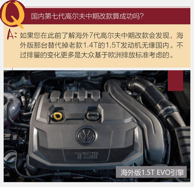 对于国内的大众迷来说今年最期待的新车莫过于中期改款的第七代高尔夫 (配置|询价)。如果非要从时间节点上来追溯,那可以说是从年初大众汽车在日内瓦车展上公布了海外版中期改款高尔夫的信息后开始。其经典设计基础上让人耳目一新的外观设计、让人垂涎三尺的全液晶仪表盘,这些改变无一不为准备入手高尔夫的消费者平添坐等新款国产的信心,这其中也包含持币待购的作者本人。对了,新款高尔夫还有一项国人最为看重的改变,1.4T车型全系更换为后独立悬挂结构。