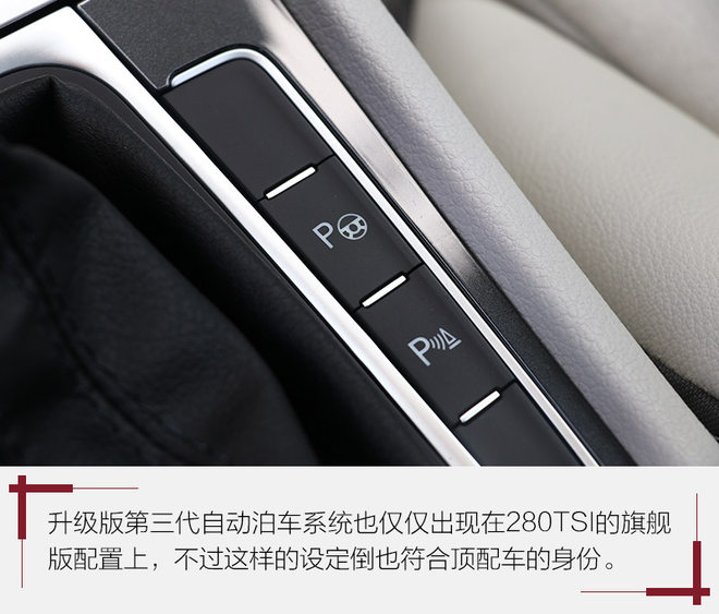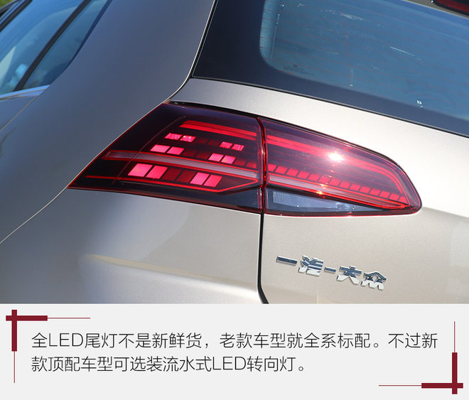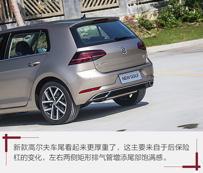 全LED尾灯虽然老款车型全系标配,不过新款在内部结构上作出细微调整,例如最下面的倒车灯装饰罩改为面积略大的透明色,显得更醒目一些。而后保险杠底部设计有两个类似于排气口的镀铬装饰罩,这一设计只有1.4T(高功率版本和R-Line版本)才具备,真实的排气布局依旧为单边双出。