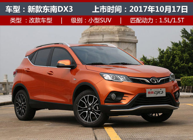 新款东南DX3针对配置方面有所调整,最大亮点在于新增电子手刹与自动驻车;外观设计与现款车型基本保持一致。动力方面,新车将搭载1.5升自然吸气和1.5升涡轮增压两款发动机。其中,1.5升发动机最大功率88千瓦,峰值扭矩143牛米,匹配5速手动变速箱;1.5T发动机最大功率115千瓦,峰值扭矩220牛米,匹配8速CVT变速箱。