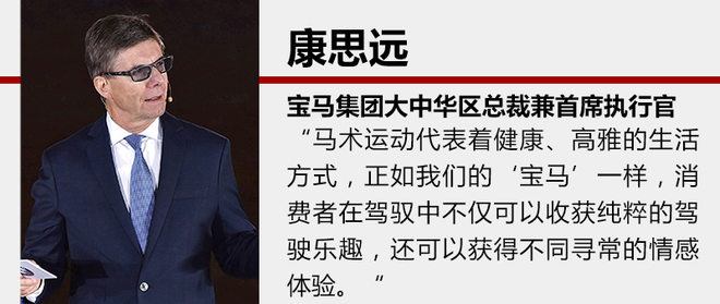宝马集团大中华区总裁兼首席执行官康思远先生出席开幕式并表示:“马术运动代表着健康、高雅的生活方式,受到越来越多高端消费群体的青睐。马术运动集优雅动感于一身,正如我们的‘宝马’一样,消费者在驾驭中不仅可以收获纯粹的驾驶乐趣,还可以获得不同寻常的情感体验。两者之间的创新精神也脉脉相通,今年首次出现车马风尚赛,也体现了BMW品牌对于超越自我的不懈追求。”