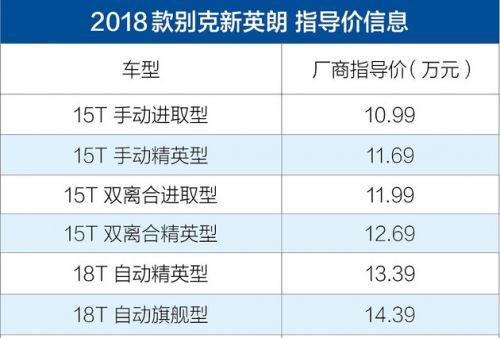 易车武汉现场报道2017年10月16日,别克新款英朗于武汉正式上市,新车将采用最新的别克家族设计风格,同时换装1.0T/1.3T动力。其共推出6款车型,厂家指导价为10.99-14.39万元,具体如下: