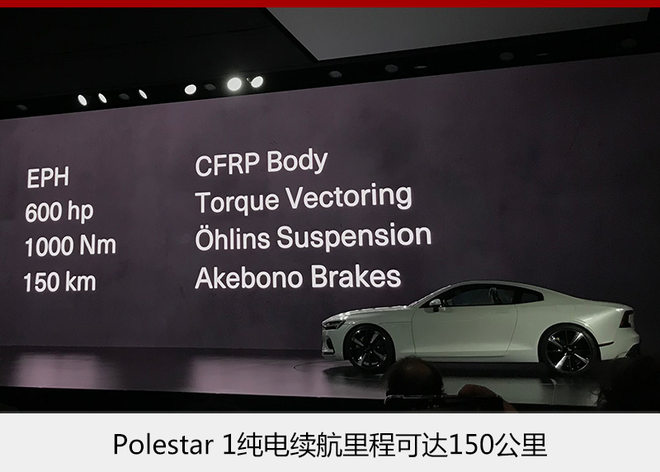 Polestar 1采用“电动高性能混合动力”驱动系统,配有一台内燃机作为辅助动力系统。新车在纯电动模式下能够行驶150公里,是目前市场上纯电动模式下续航里程最长的混合动力汽车。另外,Polestar 1拥有600马力的最大功率和1000牛米的峰值扭矩,动力性能远超同级别的竞争对手。