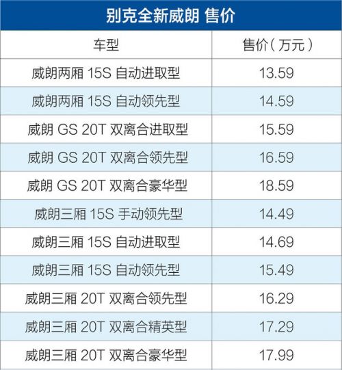 易车武汉报道10月16日,别克旗下新款威朗 (配置|询价)及威朗GS正式上市,售价13.59-18.59万元,新车共推出5款两厢版车型和6款三厢版车型。新车在外观方面作出较大改动,采用了家族式“飞翼”设计,搭载1.5L和1.5T两款发动机。
