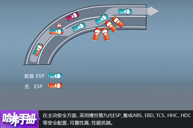 主动安全方面,标配博世第九代ESP车身电子稳定系统,集成ABS、EBD、TCS、HHC、HDC等安全配置,能够有效防止车辆发生侧翻、侧滑,使整车的安全性大大提高。