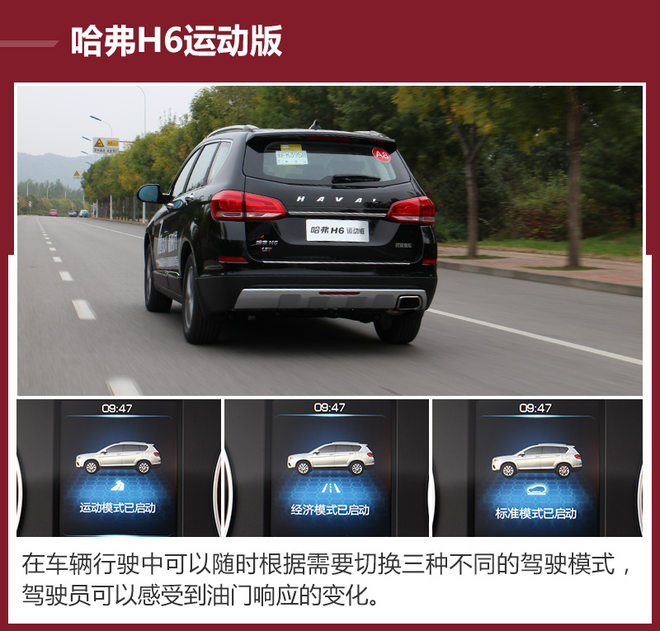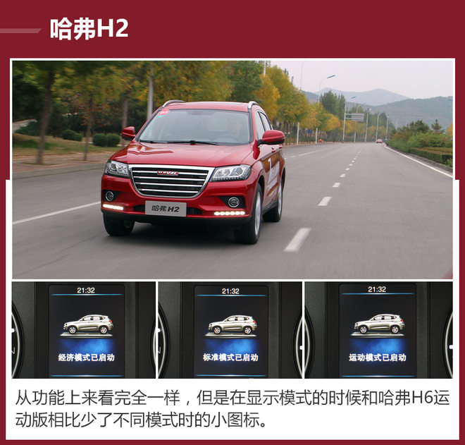 另外哈弗H6运动版和哈弗H2均提供了运动模式选择功能,其位置位于方向盘9点钟方向左侧,操作时会在行车电脑显示屏上提示。不过在驾驶中并没有出现想象中运动模式升挡所需要的转速高得明显、经济模式下变速箱升挡更积极的那种天差地别的情况,不过还是能够感觉出三种模式下油门的响应速度是很不一样的。