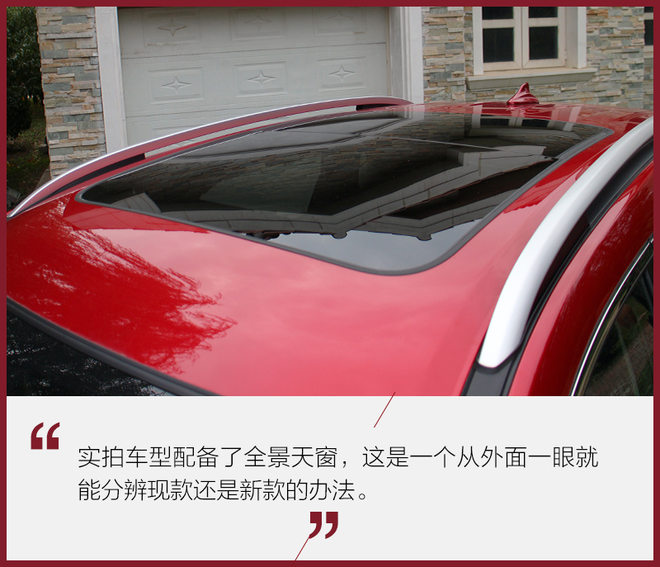 和现款车型相比,新车在外观和内饰上的改变不是很多,重点还是围绕着新的动力总成这一块而做出的改变,令人高兴的是新车增加了全景天窗这个配置。