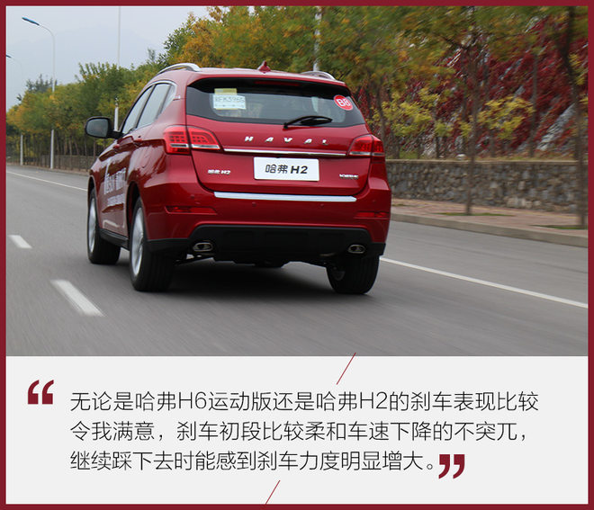 两款车在行驶的过程中除了车身尺寸和车重带来的差异之外,主要的区别在于后悬架。哈弗H6运动版采用的是双横臂独立悬架,而哈弗H2则使用了多连杆独立悬架,在过一些颠簸路面的时候哈弗H6运动版第二排乘客会感觉更颠一些。