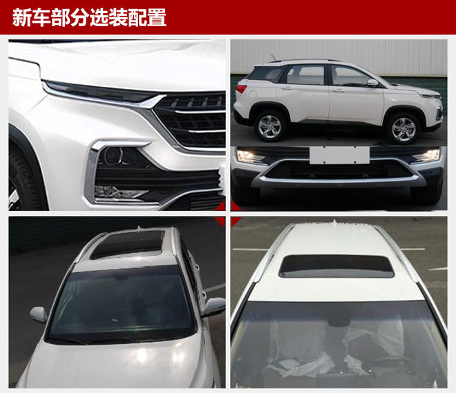 配置方面,这款全新SUV可选装日间行车灯、前雾灯、前雷达、天窗、全景天窗、倒车影视摄像头、选装另一种前挡风玻璃、前保外观(浅灰色下进气口装饰件)、水切(亮面)、车轮、后侧门玻璃(深色)、后侧窗(深色)、行李架、天线(鲨鱼鳍)、后保下装饰板、排气口装饰件、另两种侧门外开手柄(镀铬套车身色和全镀铬)等。