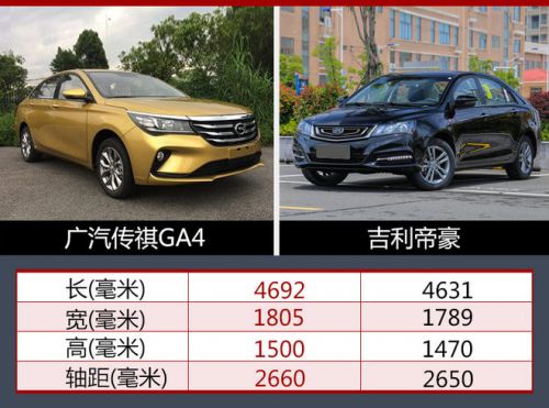 根据数据显示,广汽传祺GA4长宽高分别达到4692*1805*1500毫米,轴距达到2660毫米;与同级别车型吉利帝豪相比,新车在长度、宽度、高度以及轴距方面均占有一定优势。