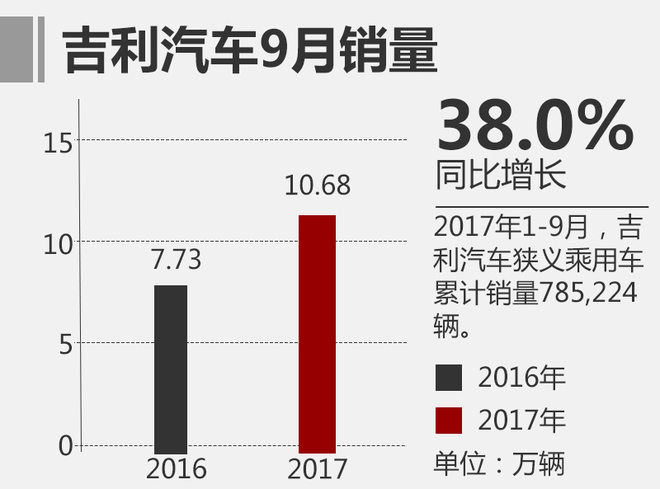 9月,吉利汽车狭义乘用车销量达到106,814辆,相比去年同期的77,396辆同比增长38.0%。1-9月份,吉利汽车狭义乘用车累计销量785,224辆,相比去年同期454,323辆同比增长72.8%。