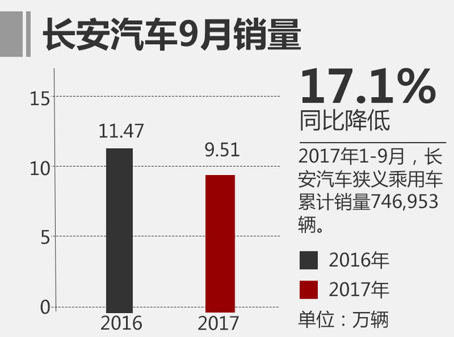 9月,长安汽车狭义乘用车销量达到95,127辆,相比去年同期的114,724辆同比下降17.1%。1-9月份,长安汽车狭义乘用车累计销量746,953辆,相比去年同期820,510辆同比下降9.0%。