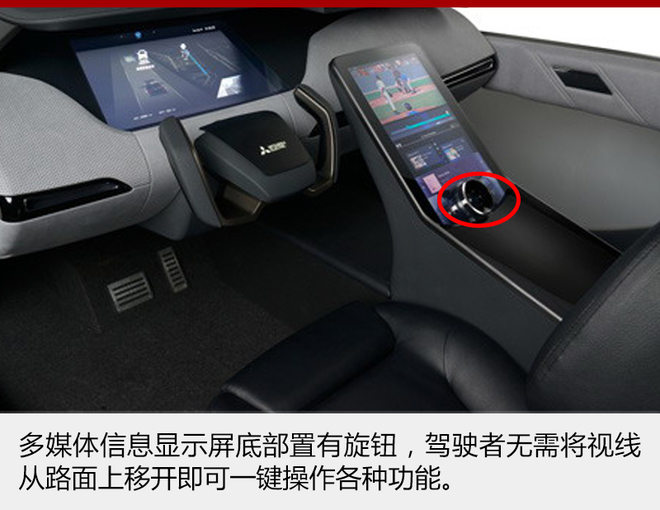 此外,三菱Emirai 4概念车多媒体信息显示屏底部置有旋钮,驾驶者无需将视线从路面上移开即可一键操作各种功能。除此之外,新车还配备有先进的安全照明系统,通过路面投影和车身显示屏,向行人及周围车辆发出警示,告知本车的行驶方向和操作动向。(图/文 网通社 裴健如)