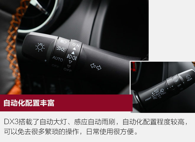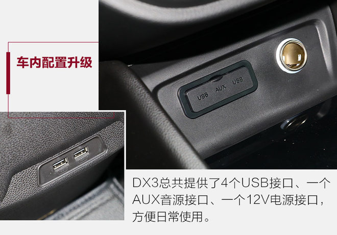 相比于2017款DX3那块不能开启的车顶玻璃,升级为全景天窗的新款DX3更符合国人的需求,其他类似后排双USB接口、自动大灯、感应雨刷、液晶触控屏等配置也是结合了消费者的需求而搭载,整体具有很强的实用性。