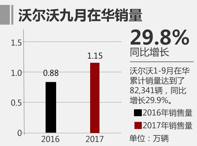 2017年9月,沃尔沃在华一共出售11,544辆新车,与2016年同期的8,891辆相比,增长了29.8%。沃尔沃1-9月在华累计销量达到了82,341辆,与去年同期出售63,387辆新车的数据相比,增长了29.9%。其中,在国内生产的XC60、S60L和S90长轴版,依旧是增长的主要动力。