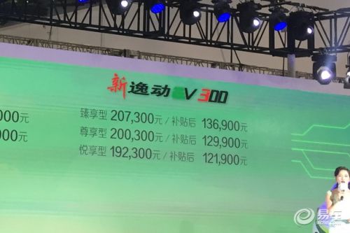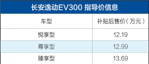 10月19日,在长安汽车新能源战略发布会上,长安逸动EV (配置|询价)300车型正式上市。新车是长安旗下紧凑级轿车逸动的纯电动版本,新车续航里程达到300km,共推3款车型,售价区间为19.23-20.73万元,补贴后售12.19-13.69万元。各款车型的售价请见下表: