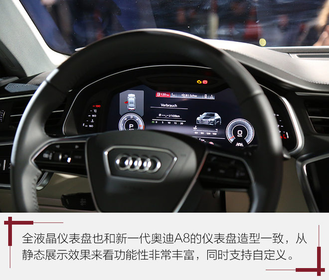 拥有1920×720像素全高清分辨率的12.3英寸数字仪表盘和新一代奥迪A8的款式相同,可以在两个用户界面之间进行选择。此外,还可以选装抬头显示系统进一步提升车辆行驶安全性。