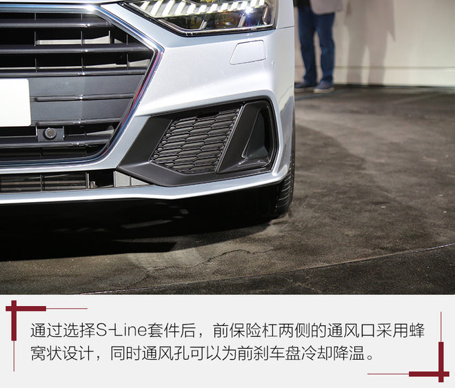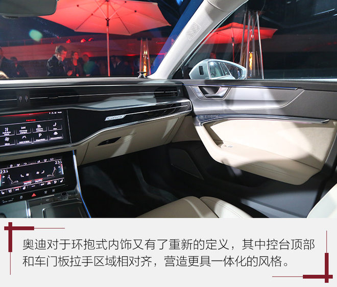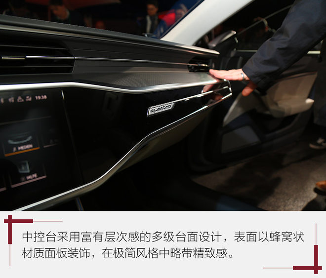 奥迪这一次重新对环抱式内饰布局进行了定义,通过中控台台面与车门板的拉手和扶手区域对齐设计烘托出其有机结合的一个整体设计造型。此外,车门板区域所使用的铝合金拉丝面板和中控台中间深色部分使用的蜂窝状装饰板都提供不错的设计感和未来感。