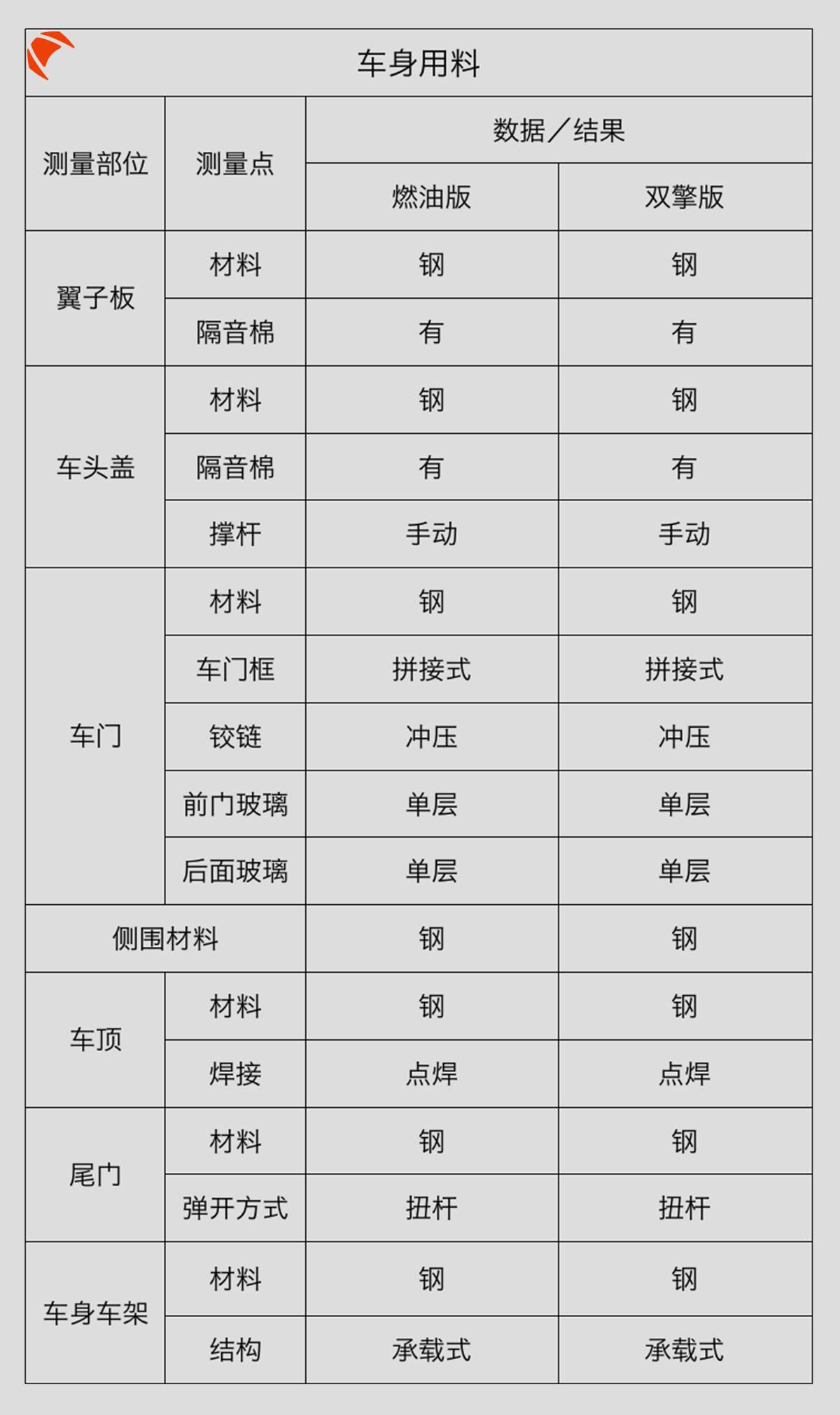 车身用料的考察点,主要是看其使用的车身材料(是钢还是铝)、工艺手段(是点焊还是激光焊)等,这部分表现将保证车辆的隔音、驾乘质感等整体品质。