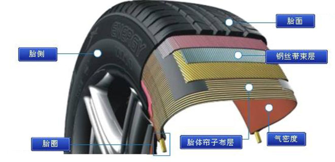 胎侧:保护轮胎免受路肩撞击等影响;胎圈:将轮胎牢牢地固定在轮圈上;胎面:在多种情况下提供牵引力,而且耐磨损、耐摩擦和耐热;钢丝带束层:为胎面提供了刚性基础,实现良好的燃油里程。这一层还为轮胎提供了抵消离心力和侧向力的强度,并足够柔软,以确保驾乘舒适度;气密度:由几乎无法渗透的丁基合成橡胶制成。在现代无内胎轮胎中,这种材料替代了原来的内胎。由于随着时间推移,胎压可能降低,所以请每个月检查一次胎压;胎体帘子布层:由细小的织物纤维粘合在橡胶上制成。这种帘子布在很大程度上决定了轮胎的强度。