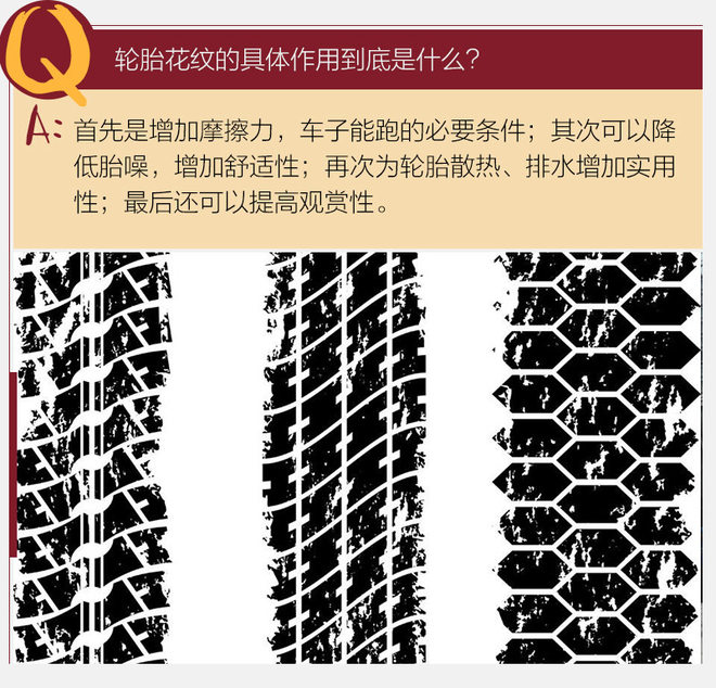 简而言之,轮胎的花纹和鞋底的花纹作用是一样的,就是增加胎面与路面间的摩擦力,以防车轮打滑。主要由花纹沟,花纹块及节距等构成。轮胎花纹提高了胎面接地弹性,在胎面和路面间切向力(如驱动力,制动力和横向力)的作用下,花纹块能产生较大的切向弹性变形。
