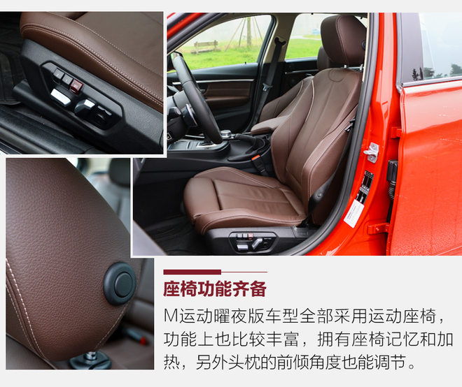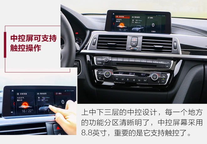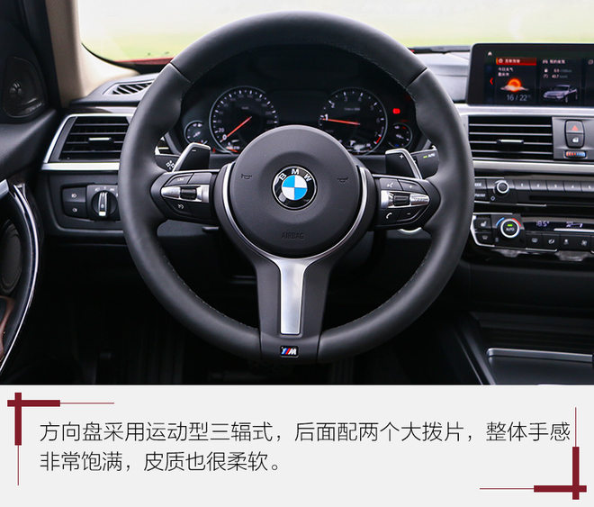 唉,BMW的内饰都不知道说什么了,因为大家都太熟悉了,尤其是3系的,典型的上中下分层设计。M样式的方向盘拥有出众的握感,后面配有两个拨片。除此之外,新车屏幕支持触屏操作、M运动曜夜版采用全液晶仪表,另外苹果手机还可无线连接CarPlay系统。
