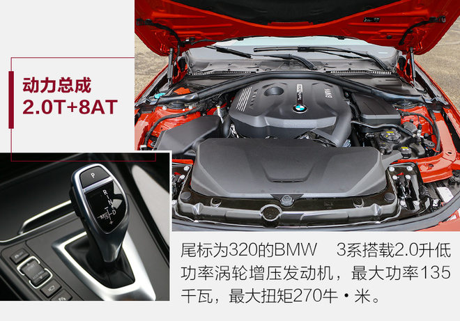 尾标数字为320的M运动曜夜版车型搭载的是低功率2.0升涡轮增压发动机,最大功率135千瓦,最大扭矩270牛•米,匹配8速手自一体变速箱。和2017款的BMW 3系在动力总成方面并没有变化。