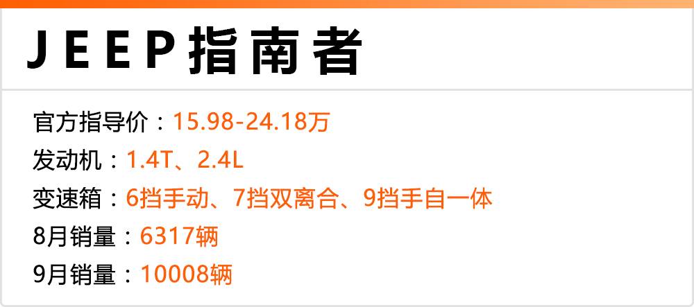 砖叔点评:指南者的销量与前面的车型相比就可能稍微有点差距,但自从与广汽组成合资公司后,JEEP在中国开始走亲民路线,一连发布了指南者、自由侠、自由光三款国产车型,价格都在合理水平。而指南者作为紧凑型SUV,承载着JEEP的希望,但一直不温不火的销量也着实让人着急,而在销量火爆的九月迎来了破万的销量,现在各地指南者车型都有不错的优惠力度,的确是入手好时机。