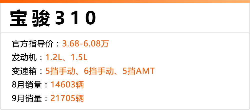 砖叔点评:宝骏310自面世以来,凭借超高的性价比,迅速俘虏许多消费者的心,17年五月以后加入了1.5L+6挡手动版本后更是成为了爆款,销量稳定在月均万辆以上,今年9月更是加入了AMT版本,增加了一波销量,一跃成为了“2万+用户”。但单论车而言,宝骏310的确是国产小型车里的佼佼者,打破了以前国产小型车粗制滥造的形象,加上不错的空间和造型,热销也在情理之中。