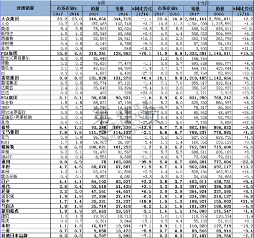 PSA集团(不包括刚收购的欧宝和沃克斯豪尔销量)和福特汽车9月份的销量出现较大下滑,而阿尔法罗密欧和西雅特则出现两位数的增长。PSA旗下品牌的销量跌幅超过5%,其中标致和DS分别下滑1.1%和28%,而雪铁龙品牌的销量则出现1.4%的增长。福特受英国地区疲软表现影响,销量下滑13%。大众集团的销量下滑1.1%,主要因大众品牌出现3.2%的跌幅。西雅特和斯柯达品牌分别出现10%和3.6%的增长,而旗下豪华车品牌奥迪则下滑3.8%,保时捷下跌9.5%。宝马集团销量下滑2.1%,旗下核心品牌宝马销量下跌1.1%,而Mini品牌的跌幅则达到5.4%。奔驰品牌销量下滑0.1%,而Smart则下跌11.7%。受菲亚特品牌销量下滑2%影响,FCA上月销量也下滑1%。由于新车型的推出,阿尔法罗密欧的销量涨幅达到16%。亚洲车企的表现要好于上月,丰田和日产的涨幅分别达到1.9%和3.3%。现代则增长2.1%,起亚则攀升6.5%。
