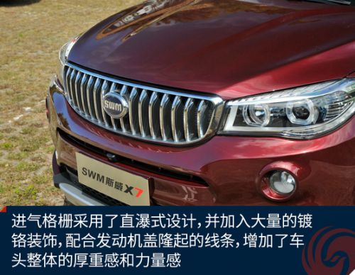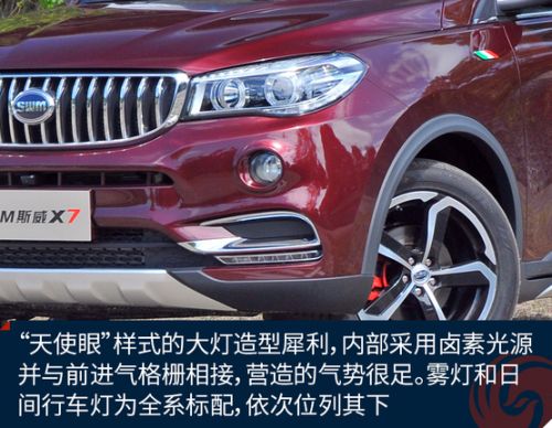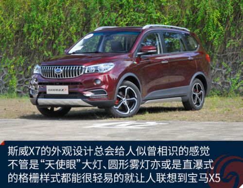 斯威X7的外观设计总会给人似曾相识的感觉,也许是由于华晨的关系,斯威也能跟宝马攀上亲戚,不管是“天使眼”大灯、圆形雾灯亦或是直瀑式的格栅样式都能很轻易的就让人联想到宝马X5。4710×1855×1770毫米的车身长宽高尺寸、2750毫米的轴距,已经达到了中型SUV的身材,在同级别车型中也占据了一定优势。