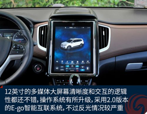 12英寸的多媒体大屏幕清晰度和交互的逻辑性都还不错,不过反光情况较严重,操作系统有所升级,采用2.0版本的E-go智能互联系统,诸如空调、多媒体等车上几乎所有的设置操作都能通过这块屏幕完成,并拥有科大讯飞提供的语音控制系统。此外,最值得一说的是,用户可以通过手机下载APP来对车辆进行信息查询或远程控制,功能性和可玩性都很高。