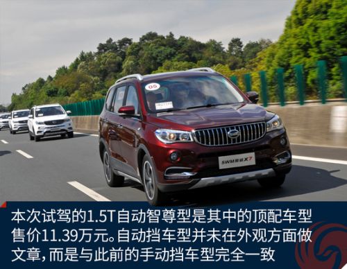 斯威X7共推出3款自动挡车型,售价区间为10.19-11.39万元,本次试驾的1.5T自动智尊型是其中的顶配车型,售价11.39万元。相对于1.8L/1.5T手动挡车型,自动挡车型并未在外观方面做文章,与此前的手动挡车型完全一致。