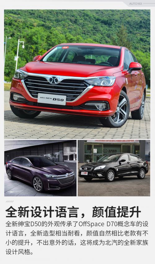 作为北汽2.0时代的开山之作,全新绅宝D50出生于北汽全新的平台,外观也采用了全新的设计语言,这也使得绅宝D50在外观上的变化翻天覆地。大嘴式进气格栅搭配大面积的镀铬装饰条虽然做法“老土”,但是效果确实不错,Logo底下的镀铬装饰条向两侧延伸,与大灯融为一体,像是为大灯加上了“灯眉”一般。整体看上去相比现款大气了许多,北汽称此设计为“京翼北脸”,不得不说,就档次感上来说,全新绅宝D50的提升还是很明显的。