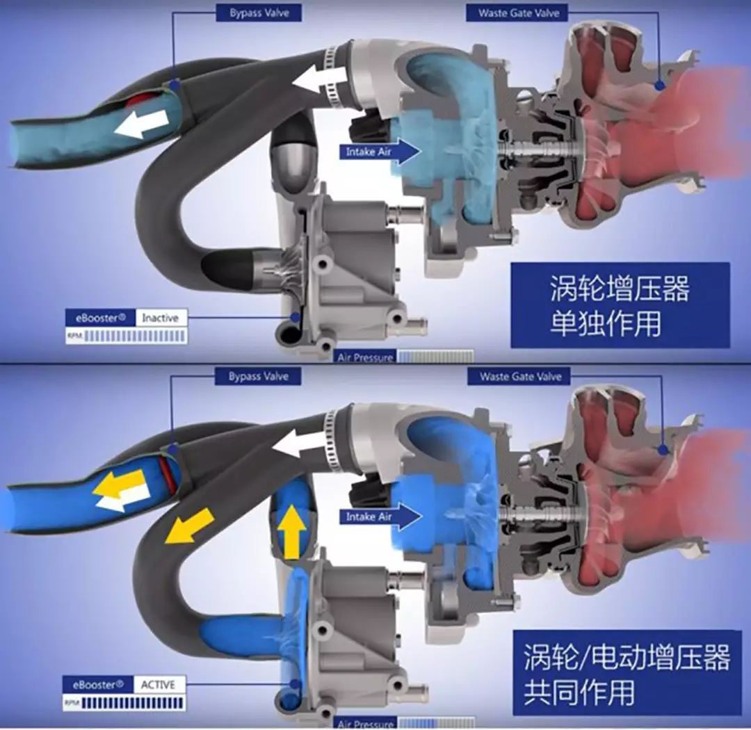 博格华纳eBooster电动涡轮可以实现72000rpm的最高转速,并且在230ms内就可以实现90%的最大转速工作,凭借着快速响应的特点,电动涡轮可以实现快速补偿废气涡轮的迟滞作用,提供线性的动力输出,从源头解决问题。