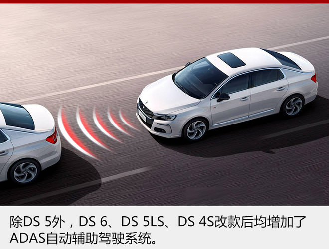 除DS 5外,DS 6、DS 5LS、DS 4S改款后均增加了ADAS自动辅助驾驶系统,该系统包括了车道偏离预警系统、驾驶注意力辅助、限速路牌智能识别、自动紧急刹车系统、自适应巡航带刹停功能、智能远近光切换6项高级驾驶辅助功能,大大提高了车辆在行驶过程中的安全性。并且还升级了全新的智能互联系统,配备8英寸多点触控屏,拥有手机互联、在线导航、车辆控制管理等多项功能,还集成了第二代DS CONNECT智能互联系统,大大提升人车智能交互。