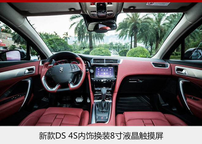 新款DS 4S换装8寸液晶触摸屏,并搭载全新的中控影音娱乐导航互联系统,拥有全新的第二代DS CONNECT智能互联,支持苹果CarPlay和MirrorLink,提供车辆控制管理功能,支持智能在线导航。中控区按键也得到重新排列,省略一些中控物理按键带来更简洁的视觉效果。新车还采用全新的内饰配色,双色Claudia真皮内饰搭配和橙色Nappa高级真皮内饰,突出新车的豪华感。