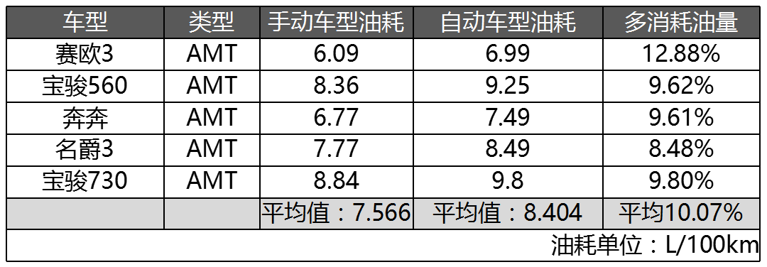 AMT变速箱的车型以微弱的优势领先AT拿下第三,超过了10%的油耗增加量对于车主来说也是不小的负担吧。虽然AMT车型结构上更加接近于手动挡,但是在油耗表现上却并不是厂家宣传的那么理想。不过毕竟它还是有低成本优势,而且要统计的这几款车型中四款都是自主品牌车型,考虑到自主车型在技术实力上稍有落后,所以AMT变速箱的节油表现相比较AT来说在技术水平相同的前提下确实更好。