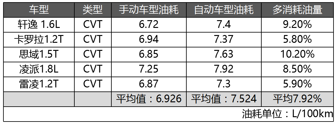 其中表现最优秀的是卡罗拉和雷凌两款车型。这两款车型相比各自的手动挡车型多消耗的油量不到6%,加上本身车辆的油耗就很低。所以如果想要买一台节油的车,卡罗拉和雷凌的1.2T值得考虑。