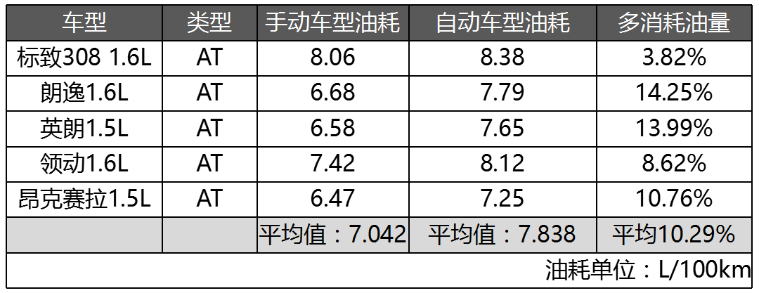 都说AT变速箱虽然可靠,但是油耗表现最弱鸡。而从实际数据上来看也确实如此,要知道阿宅统计的标致、大众、别克、现代以及马自达这五个车企都是属于技术实力一流水准。即使是这些厂家,它们的车型搭载的AT变速箱载油量消耗上也要比自家的手动挡车型高出许多,其中最高的朗逸甚至达到了14.25%。虽然标致308只多消耗了3.82%,但是它的手动挡车型油耗也超过了8升/100公里,因此308这个成绩也没有什么好炫耀的。看来AT车型油耗高的传言并不假。