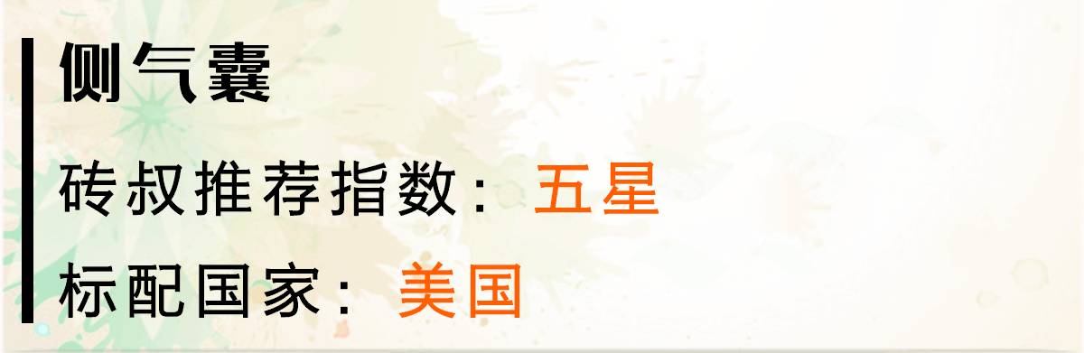 作为汽车工业强国,美国于2013年便立法规定在售车型必须安装侧气囊,走在了其他国家前面。现在许多碰撞测试机构也十分注重侧撞的评分,基本没有侧气囊的车型很难获得太高的评价。