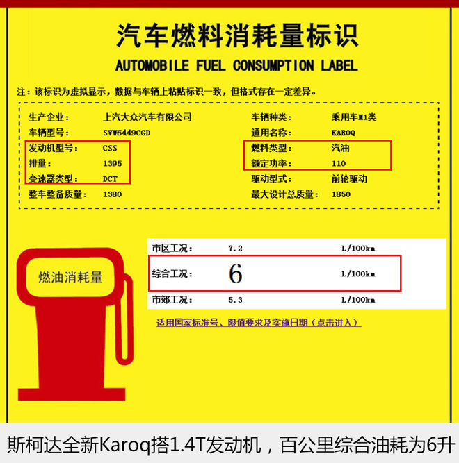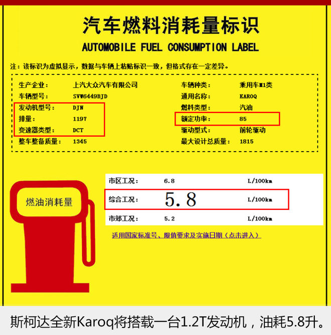 从斯柯达的新车规划来看,除今年上海车展期间推出的柯迪亚克之外,还将推出一款全新紧凑型SUV——Karoq,以全面开启斯柯达在华的SUV攻势。近日,网通社从国家工信部获得一组国产Karoq车型的燃料标识申报信息。新车将搭载一台1.2T和一台1.4T涡轮增压发动机,百公里油耗最低仅需要5.8升。