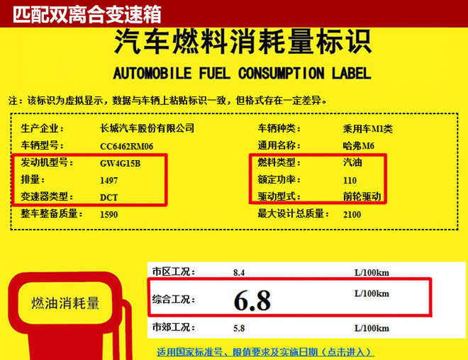 从国家工信部公布的信息可知,哈弗M6将搭载一台型号为GW4G15B的1.5升涡轮增压发动机,额定功率110千瓦,匹配DCT双离合变速箱,百公里综合油耗仅为6.8升。