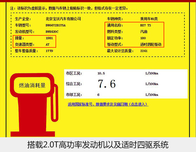 宝沃BX7于去年北京车展开幕日当天正式上市,除了6款普通版28T车型外,BX7 TS特装运动版也一同公布了售价,为30.28万元。今年8月,BX7 TS在纽博格林北环赛道完成了最终测试,到年底将会陆续交付用户。近日,网通社从国家工信部获得了BX7 TS的燃料标识申报信息;新车搭载高功版2.0T发动机,与BX7相比,最大功率增加15千瓦。