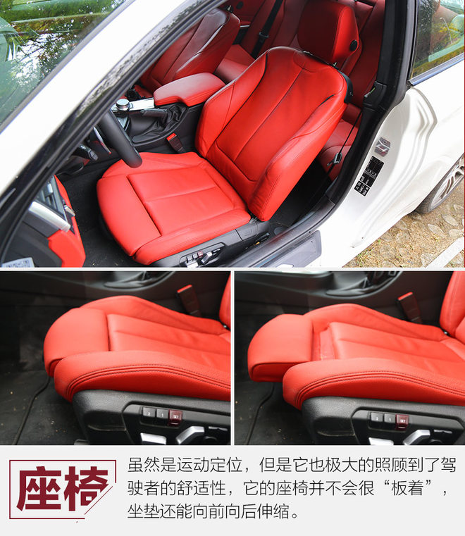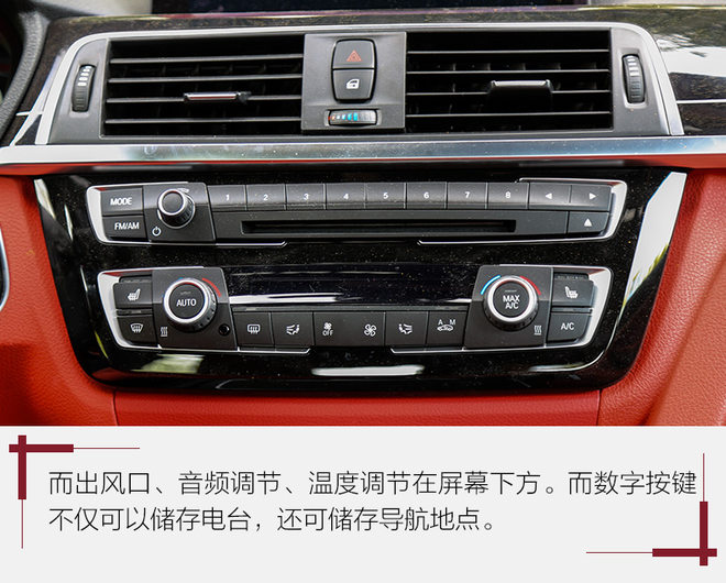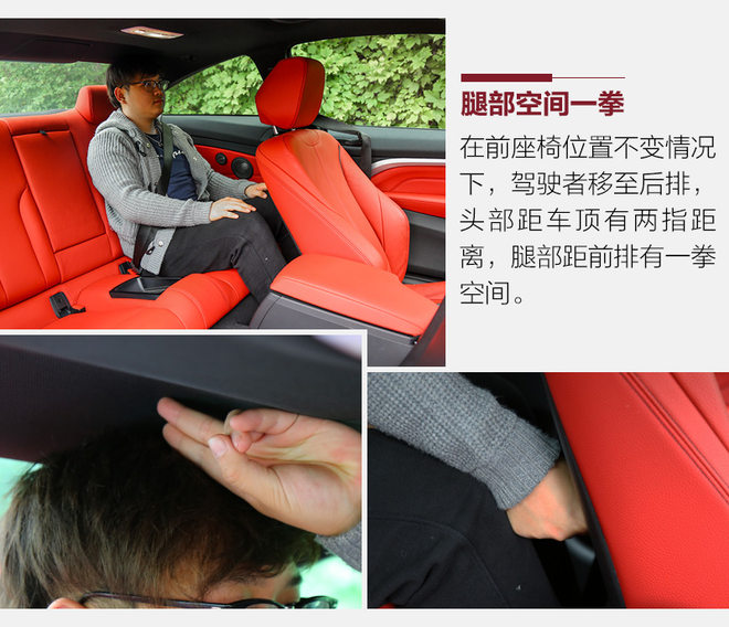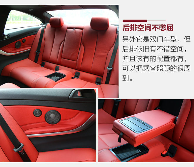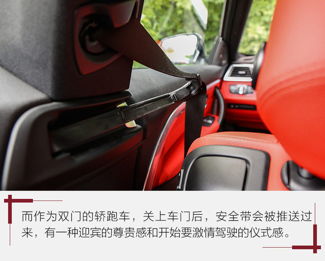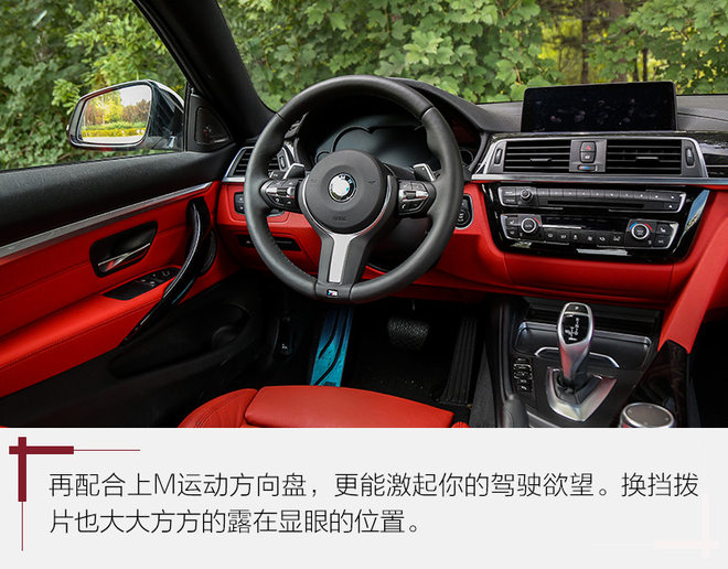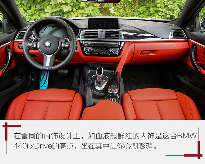 如血液般鲜红的内饰是这台BMW 440i xDrive的亮点,艳的不俗气,也不会像纯黑内饰那样让人感到压抑。方向盘、中控台、人机交互系统都是BMW车型标准模块下的产物,不过iDrive系统的旋钮很大,用着很舒服,驾驶模式选择也更靠近驾驶席位置,使用都很方便。