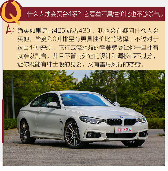 结语:BMW 440i xDrive是那种你看着不激情,开着也不燥,但接触之后就让你离不开的车。不管在弯中还是直线,都快的那么行云流水。而且它还保持一定的舒适性,不管底盘的调校还是乘坐空间,都不会让你在用车过程中感到疲惫,它可能不是动力最强、相貌最狠的,但却是最难以割舍的。(图/文/摄 网通社 任宏斌)