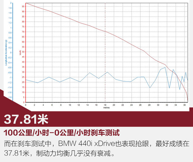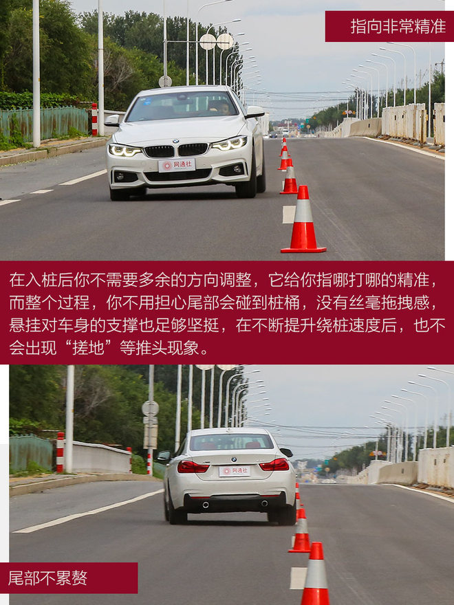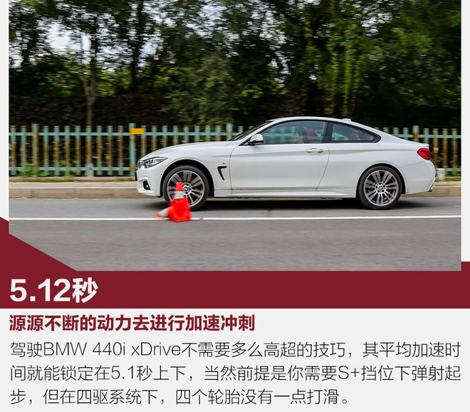 BMW 440i xDrive是双门车型,这相比四门的AMG C 43 4MATIC要拉风不少,并且在绕桩测试等项目中,更能清晰的感受到尾部的随动。当然它也同样搭载了四驱系统,所以即使ESP全关,采用弹射起步,轮胎也并没有打滑。