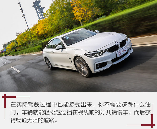 BMW 440i xDrive就是搭载直列6缸3.0升排量涡轮增压发动机的车型,如果说2.0升排量的车让你在超车时无需做什么“心理建设”,那么开这台BMW 440i xDrive,你只用轻点油门,就能见缝插针式的“塞”入前车。再配合上BMW舒爽的操控,当完成这一系列动作之后,你不免嘴角上扬。