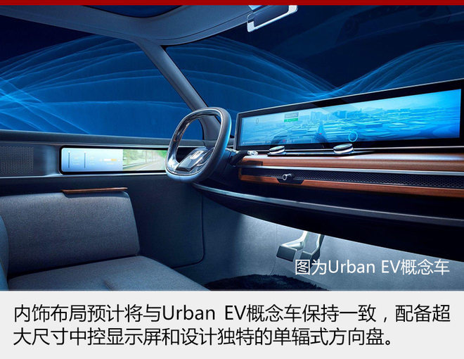 新车的内饰布局预计将与Urban EV概念车保持一致,配备超大尺寸中控显示屏和设计独特的单辐式方向盘,中控屏可显示车辆的续航、剩余电量、能量损耗情况等信息。同时,预告图上也并未看到传统的外后视镜,预计新车将会采用两侧车门处的显示屏通过数码摄像机显示路况信息和车辆周围环境。