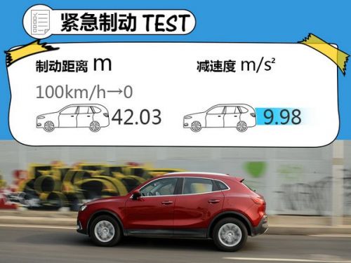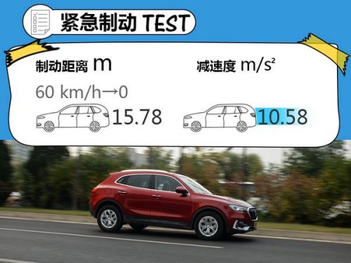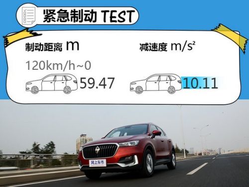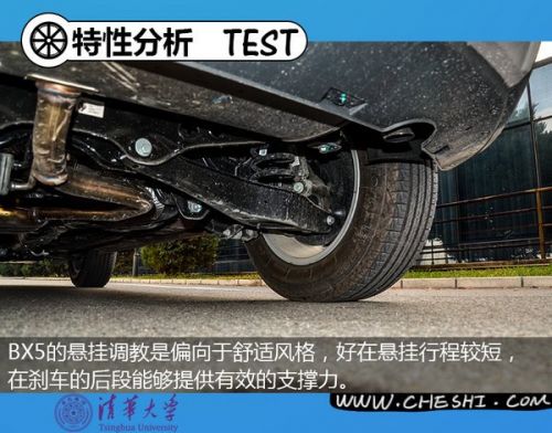 模拟城市一般道路的60km/h至静止的刹车测试中,BX5的成绩为15.78米,减速度为10.58米/秒。从这个成绩来分析,BX5的低速减速度非常之大,在60km/h全力踩下制动踏板时,刹车力的释放已经接近于120km/h的制动力。可以说BX5的刹车能力令人很有底气,但是由于踏板行程的问题,主观感觉并不是让人很放心。